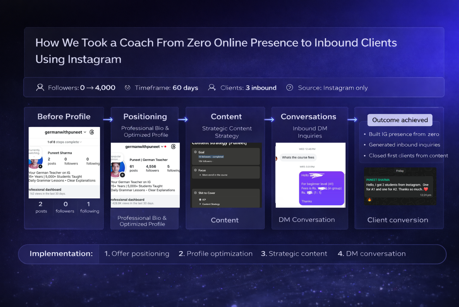 We helped an offline coach launch on Instagram with a clear offer, positioning, and content direction.